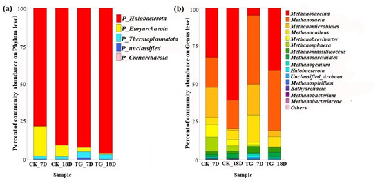 Archaeal community composition and structure at (a) the phylum level and (b) genus level. Statistical analysis was performed by Student’s t test. Note: p < 0.05. CK-7D and TG-7D were the samples of the control group and the treatment group on the 7th day. CK-18D and TG-18D were the samples of the control group and the treatment group on the 18th day.