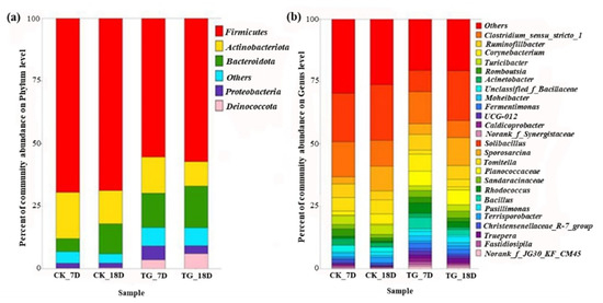Bacterial community composition and structure at (a) the phylum level and (b) genus level. Statistical analysis was performed by Student’s t test. Note: p < 0.05. CK-7D and TG-7D were the samples of the control group and the treatment group on the 7th day. CK-18D and TG-18D were the samples of the control group and the treatment group on the 18th day.