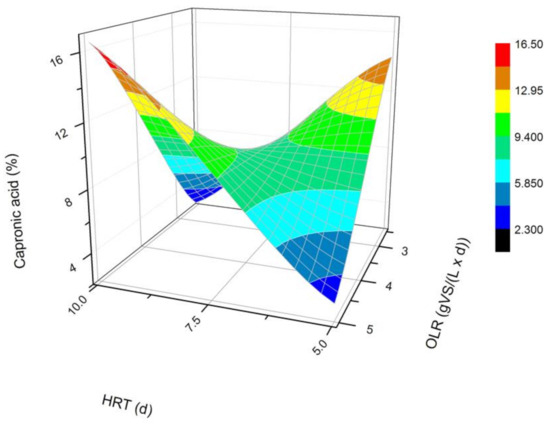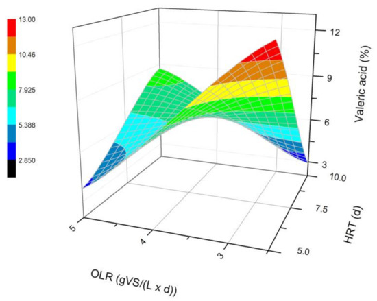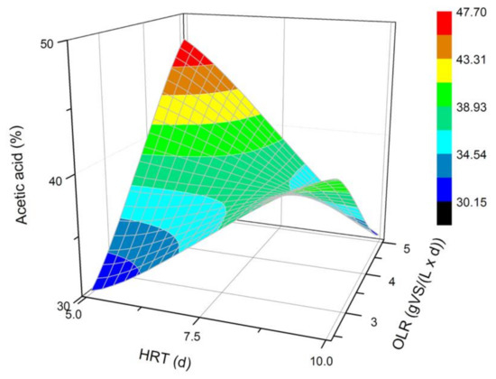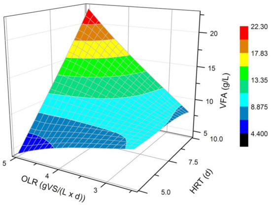 According to the obtained data, the OLR of 5.0 gVS/(L × d) and the HRT of 10 d seem to be the most favorable for the production of VFAs in a semi-continuous system (Figure 1). This finding suggests that the daily dose of the substrate in the amount of 5.0 gVS/(L × d) corresponded with the inoculum volume in the bioreactor, which over 10 days was able to convert the supplied organic matter into high concentrations of VFAs. The OLR of 5.0 gVS/(L × d) and the HRT of 5 d was confirmed to be the least favorable for VFAs production. The reason for such an effect was probably that the HRT of the fermentation mixture in the bioreactor was too short in relation to the amount of delivered organic matter. Slowly reproducing microorganisms could have been washed away, leaving microbes with a higher growth rate in the fermentation medium.