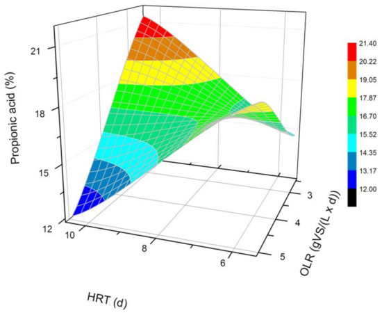 Changes in the content of propionic acid produced in a steady state during the DF process at the OLRs of 2.5 gVS/(L × d) and 5.0 gVS/(L × d) and the HRTs of 5 d and 10 d.