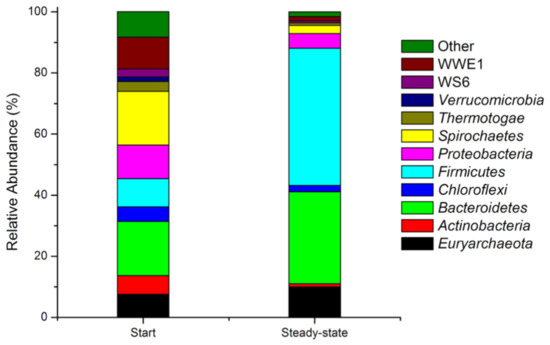 The most common phyla identified at the beginning of the performed fermentation were Bacteroidetes (17.7%), Spirochaetes (17.6%), Proteobacteria (11.0%), WWE1 (10.4%), and Firmicutes (9.2%). In addition, the following phyla were present in the fermentation mixture: Euryarcheota (7.6%), Actinobacteria (6.1%), Chloroflexi (4.8%), Thermotogae (3.2%), Verrucomicrobia (1.5%), and WS6 (2.6%). The remaining phyla forming the group “Other” (8.4%) cluster these microorganisms that are present at abundancy lower than 1%. In a steady state, the profile of microorganisms has changed significantly. The number of microorganisms belonging to Firmicutes, Bacteroidetes, and Euryarcheota increased noticeably, constituting 44.9%, 30.1%, and 10.0%, respectively. The loads of other phyla decreased, including Actinobacteria (1.0%), Chloroflexi (2.1%), Proteobacteria (4.8%), Spirochaetes (2.7%), WWE1 (1.3%), WS6 (0.7%), and Thermotogae (0.8%). Phylum Verrucomicrobia was not identified in a steady state, and the group “Other” accounted for 1.6%.