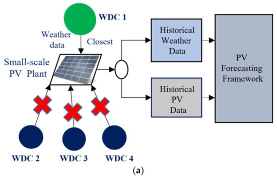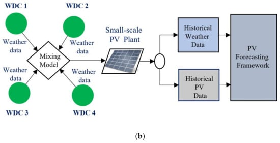 STPF of a small-scale PV plant: (a) conventional method to collect weather data from the closest WDC, (b) proposed mixing model to collect mixed weather data from the four WDCs.