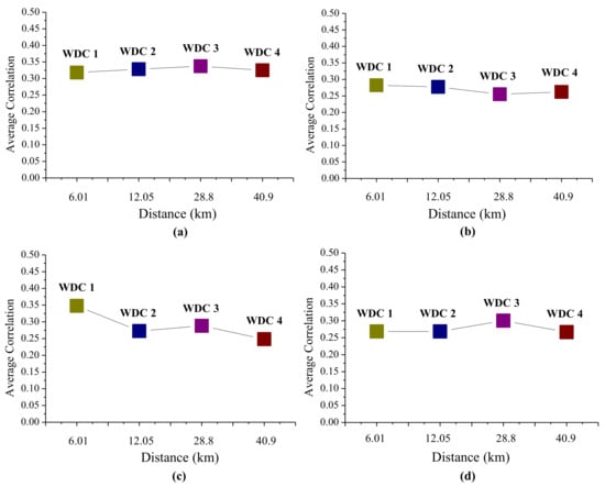 Monthly average correlation between the PV generation data and cloud cover data from the four nearby WDCs: (a) April, (b) August, (c) October, (d) December.
