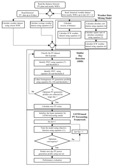 The raw weather data from the closest WDC, average weather data, and mixed weather data obtained based on the two proposed models might be dissimilar, although the same SDD is applied. Consequently, four different homogenous PV series, , , , and , were obtained from the SDD. These series contain different numbers of homogenous PV generation profiles, although the selected PWVs and SWVs are the same. Each SDD output series is passed to the LSTM-based forecasting framework for the next-day PV prediction and comparison of results. Figure 3 illustrates the overall flow chart of the proposed weather data mixing model-based day-head PV forecasting framework for small-scale PV plants.
