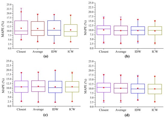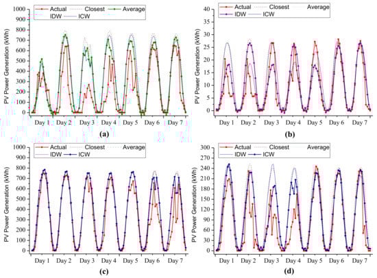Table 4 shows seasonal average MAPE and RMSE results from the proposed models and existing methods of the PV plants 1, 2, 3, and 4. For PV plants 1 and 4, the proposed ICW model shows improvements above 0.8% and 0.3%, respectively, in terms of forecasting MAPE compared with the average weather data (the second-best performer). In the case of PV plant 3, the IDW model shows improved forecasting MAPE and RMSE results, above 0.2% and 2.58 kWh, respectively. Because PV plant 3 has one WDC located at a distance of 5.27 km, the IDW model provides improved RMSE results compared with the correlation-based ICW model.