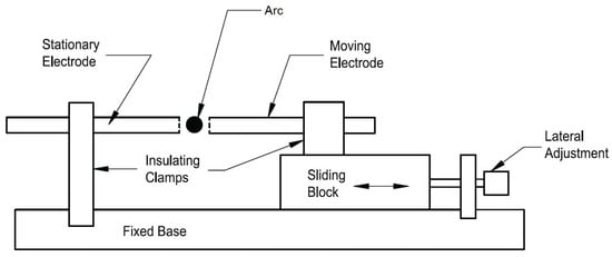 The electrodes can be separated by using the lateral adjustment mechanism, placing the movable electrode at the desired gap. The electrode material employed for the tests is graphite and copper, of 6 mm diameter. Two adjustable fixing knobs are added to the apparatus at the end of the graphite electrodes, as presented in Figure 3.