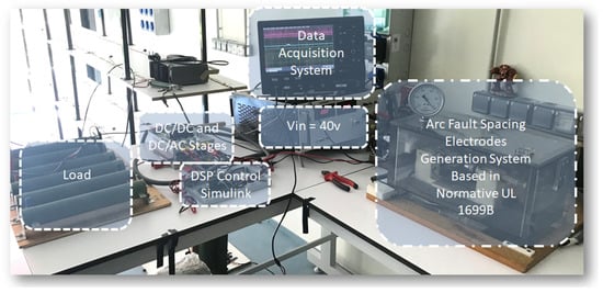 The PV power source can be either PV panels or a DC conventional source that possesses similar characteristics to a PV array in normal conditions. In this study, we adopted the use of ideal DC sources to supply the converter topology chosen. The block diagram presented in Figure 4 is an optimal circuit that permits analyzing the internal voltage and current fluctuations caused by the apparition of the series AF. Figure 5 shows the experimental test bench used during the totality of tests. Table 1 lists all the component values, switching frequencies, and input voltage for the experiments.