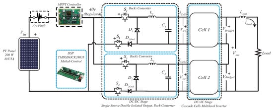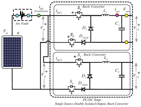 The converter in [17] achieves a low-distorted nine-level output using twelve switching devices; a downside to be considered is that this converter needs to be feed with a higher voltage input than the desired output. The authors of [17,18,19] produced the same nine levels at the output, which is a positive feature, but the development in [20] is also able to achieve nine levels by using fewer components. This last feature is highly priced in the actual trend of power converter development since it helps to increase power density and reliability. The converter in [21] generates seven levels by only using ten switching devices, which is possible by connecting in series two three-level flying capacitor typologies divided by half bridge cell; the only required condition for it to work properly is to pre-charge the capacitors at , and . This arrangement is possible thanks to the innovative balancing control proposed in the work. The converter in [22] presents an attractive option since it uses a low number of components and possesses a voltage elevation feature; unfortunately, the converter makes use of a galvanic transformer. The elevation and reduction of voltage is a feature that is less common in converters that generate multiple voltage sources from a single source; four examples of these converters are presented in [20,22,23,24]. The next converter, presented in [25], uses a clever arrangement of replacing one of the DC sources by a large capacitor. The downside of this converter is that the voltage of the DC source and the capacitor needs to be carefully controlled, otherwise the output generated will be distorted. The converters proposed in [21,26,27] also generate only five levels at the output, decreasing the performance of the proposals compared to the rest of the cited converters. Focusing in the converters found in [23,24], both remain strong proposals since no transformer is used and the output generates a relatively high number of levels. However, the authors of [17,18,20] could achieve a better output using fewer components. Two converters that replace the input source with a capacitor are presented in [27,28], but the problem related to stable capacitor balancing can be challenging in high-power applications, as explained in both works. Similarly, in [21], a five-level converter with a lower number of components compared to those in [25,27,28] is proposed, but it also has the balance control problem. The design techniques in [19,22] also stay behind the other cited works due to the use of transformers compared to the rest of the converters [18,21,23,24,25,26,27,28,29,30,31] Thanks to the review of the related single sourced converters, we can conclude that the double buck converter used in this study possesses strong features and will allow a proper characterization of the variations found with the apparition of an AF on the DC side.
