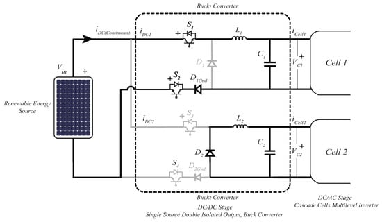 In the converter architecture of Figure 6, and blocks have two possible switching states each, first when and ( and for buck2) are in conduction state (on) (, ) and a second state when open (off) (, ). The four possible topological combinations that can be achieved for this configuration of parallel connected converters are presented in Table 2. The strategy is to alternate the power extraction from the DC sources, which is possible by the phase delay of 50% applied between and , as described in Equations (1) and (2). The states , and , , where both converters will be (on) at the same time, have to be avoided to conserve the isolation between and . This is one limitation of this parallel buck topology since the maximum duty cycle is of 50%.
