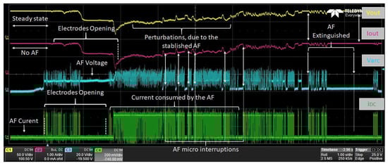 The response of the DC/DC converter is presented in Figure 11. The output voltage (C1) and current (C2) are correctly regulated just before the apparition of the AF. Once the AF ignites, both voltage and current are affected. During the initial 1.8 s, the arc current consumption remains low, but, when the arc reaches a fully sustained state, both voltage and current are severely affected (3 s after the AF) and strong perturbations are visible. In this experiment, we can appreciate how the AF continues to produces aleatory changes in and until it disappears from the system. Signals (C3) and (C4) help in the interpretation of signals. Since no closed-loop control regulation is implemented, the DC/DC converter follows the arc fluctuations as long as the arc persists. The signals and , as also presented in Figure 11, help determine if the disturbances present in and are truly caused by the presence of an AF, which is achieved by verifying whether is different from zero during the time t under study. This experiment allowed us to conclude that the DC/DC stage converter in an open-loop control will limit its functioning to follow the fluctuations of an AF. To analyze the signals, in the next experiments, the same protocol was followed.