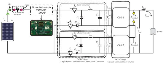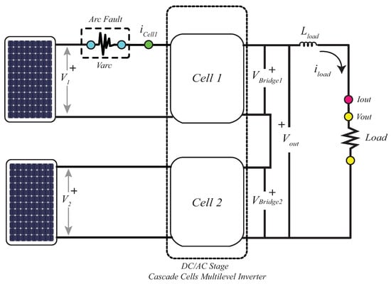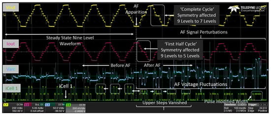 As observed previously, the AF perturbations produce fast random voltage and current variations in the DC/DC output. With those results obtained, we proceeded to study the cascade cells DC/AC converter behavior under the AF presented in Figure 12. The strategic point of measurement for this case are , , and highlighted in Figure 12.