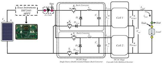 The original idea of MLIs was to multiply the power performance by employing multiple cells in series and clamp the voltages between them. A patent appeared in 1975 [10], in which the term of “cascaded inverter” was first defined, which was formed by an arrangement of full H bridge cells connected in series fed by independent DC sources [11]. Since all PV installations use a DC/AC converter to exploit the energy produced, it is fundamental to have a deep understanding of the effects of the AF in them, as well as in the main conversion and regulation blocks.