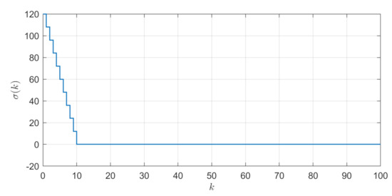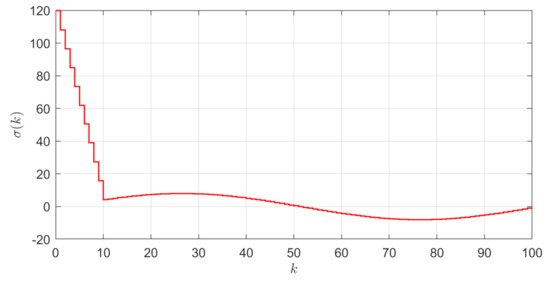 When the control signal is designed in such a way, the a priori specified evolution of the sliding variable (4) is ensured. However, such an ideal control signal can hardly be obtained in practice since the formula describing it contains the unknown at time k disturbance term . To make the reaching law-based strategy applicable to the considered systems, this term needs to be estimated. Most commonly, it is either assumed that the estimate or that it is a constant equal to the mean value of the disturbance. Consequently, in the presence of uncertainties, reaching law (4) becomes