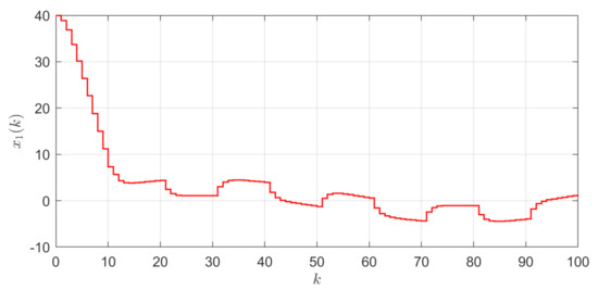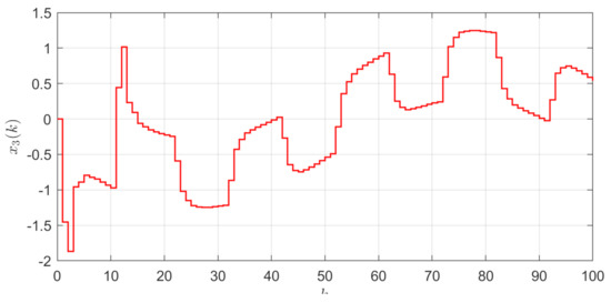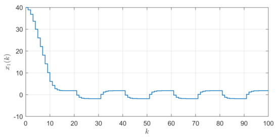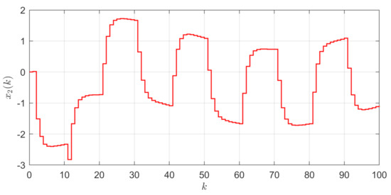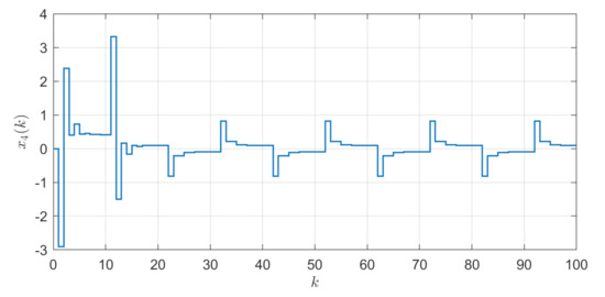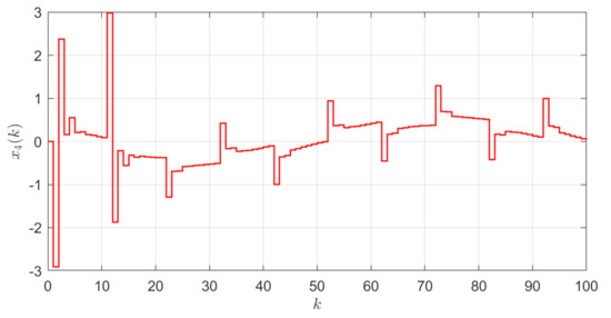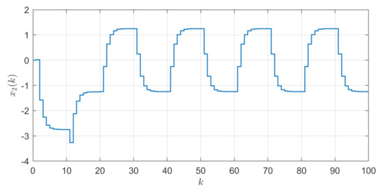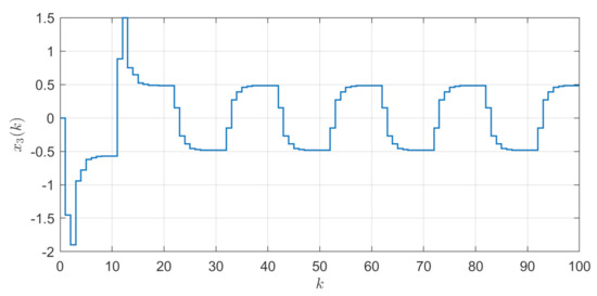 One cannot select vector that will simultaneously ensure , , and place all closed-loop poles inside the unit circle. Thus, obtaining ideal discrete-time sliding motion such as the one in Figure 1 is not possible. However, as shown in Section 3, one can still partially eliminate the effect of this disturbance on system sliding motion. In particular, if vector is selected as in (49), then and part of the disturbance can be rejected. We use the control signal (34) with . Since both parts of the disturbance are symmetrical with respect to 0, estimate . Results of the simulation are depicted in Figure 6, Figure 7, Figure 8, Figure 9 and Figure 10.