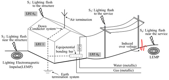 - International Electrotechnical Commission. Protection Against Lightning—Part 4: Electrical and Electronic System within Structures; IEC 62305-4; International Electrotechnical Commission: Geneva, Switzerland, 2003. [Google Scholar]