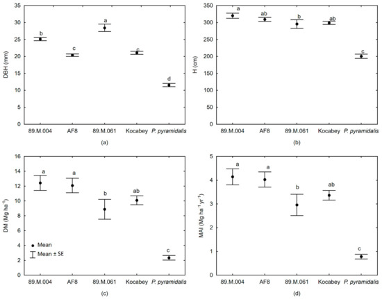 Mean values ± standard error (vertical bar) for: (a) diameter at breast height (DBH (mm)), (b) height (H (cm)), (c) dry matter yield per unit area (DM (Mg ha−1)), (d) mean annual increment of dry matter yield (MAI (Mg ha−1 yr−1)) for clones. The values expressed per unit area were calculated, taking survival rate into account. The same letters indicate statistically homogenous groups of clones at p < 0.05 in the LSD test.
