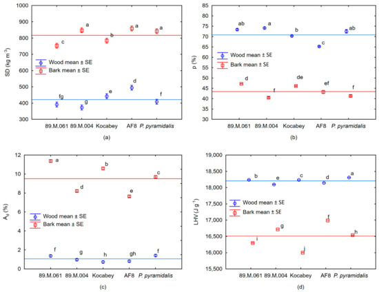 Mean values ± standard error (vertical bar) of wood and bark for: (a) specific density (SD (kg m–3)), (b) porosity (p (%)), (c) ash content (Ad (%)), (d) low heating value (LHV (J g−1)). The same letters indicate statistically homogenous groups of clones at p < 0.05 in the LSD test.