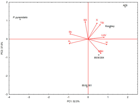 The results of the PCA are shown in Table 6 and Figure 4. The eigenvalues calculated, based on the correlation matrix, showed the dominance of the first principal component, which explained 52.52% (eigenvalue = 4.2) of the variance and was mainly associated with H, Sb, Ad, and LHV, while the second PC was mainly associated with DBH, S, TSI, and SD, and explained another 37.63% (eigenvalue = 3.0) of the variance. Overall, the first two components explained a large part of the variance, amounting to 90.15%