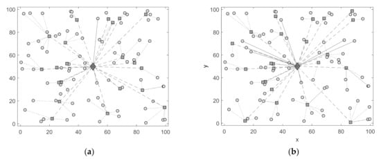 In Figure 4, the base station is placed at the center of the sensing area and symbolized with a gray color diamond marker. On the other hand, normal sensor nodes are represented as gray color circles, while cluster heads are indicated with gray color squared markers. In contrast, dead sensor nodes are illustrated with black color circles. Regarding the communication links, every normal sensor node that belongs to a specific cluster has a connection line to its cluster head identified by a particular line style, which is a dotted line. Similarly, the communication between every cluster head and the base station is represented with a dashed line. Finally, a simple line represents the communication link of every normal sensor node that is not part of a cluster and transmits directly to the base station.