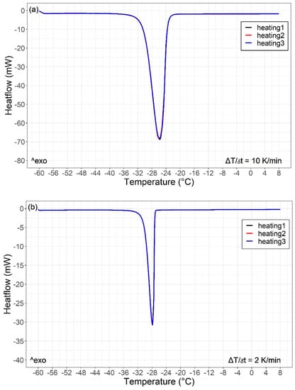Example of DSC melting curves resulting from measurements with (a) 10 K/min to determine the phase change enthalpy and (b) 2 K/min to determine phase change temperature. In both cases, all three repetitions are plotted in the same graph, showing the very consistent melting behavior that n-decane presented.