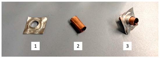 Figure 2 shows an example of the untreated metallic samples. To determine the corrosion rate of the different metals in contact with the chosen PCMs, immersion tests of the metallic samples in the PCMs were performed. For each PCM, three tests were conducted. One with aluminum, one with copper, and one with a combined aluminum/copper sample to account for galvanic effects. The cylindrical copper samples had a fixed wall thickness (H) and a fixed outer diameter (W). The aluminum samples were cut into rectangular shapes with a width (W) of 15 mm and a wall thickness (H) of 0.1 mm. The surface of the extra aluminum surrounding the hole in the center of the samples was considered to be equal to the material that would be needed to cover the hole. Therefore, the aluminum samples were handled as perfect rectangles.