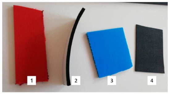 Photograph of polymeric samples (1: polypropylene. 2: neoprene. 3: polyethylene. 4: butyl rubber) which were used for the material compatibility experiments.