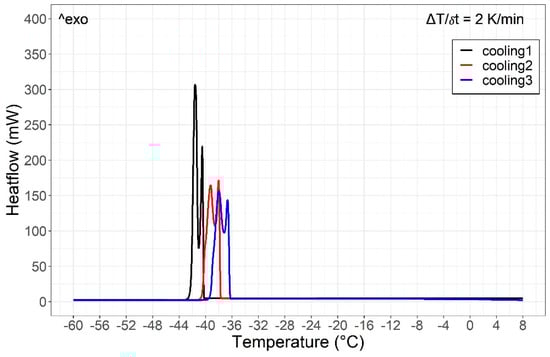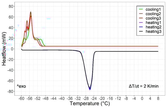 Similar effects were observed in the case of the Al(NO3)3/water PCM in all three repetitions of the cooling curves with Al(NO3)3/water 30.5 wt.% as they were measured by DSC at 2 K/min (see Figure 5). The presence of multiple and shifted peaks during cooling also indicate the formation of various phases during crystallization that could be attributed to supercooling and mixing effects. It can also be observed that crystallization is still ongoing when the device reaches its lower temperature limit (−60 °C) which required the addition of an isothermal step at the end of the process to ensure complete sample solidification. Further studies in larger devices, where less supercooling is present and/or with the presence of nucleation or gelling agents, can be conducted to further investigate these effects. It has to be noted that in contrast to the inorganic PCMs, all organic PCMs exhibited single phase transformations and very good repeatability.