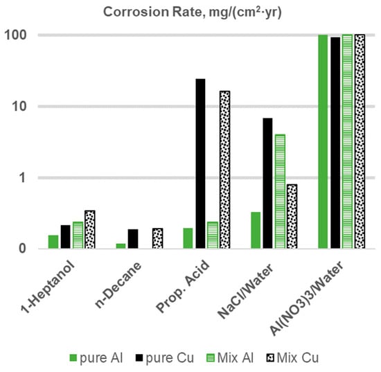 The summary of the resulting corrosion rates can be seen in Figure 6. The suitability of the PCM/metal combinations can be then evaluated using the values reported in Table 5. The combined information shows that the Al(NO3)3/water PCM is not suitable for implementation in a latent heat storage application where it would be in contact with any copper or aluminum parts. Propionic acid is also found to have a critically high corrosion rate with copper. As latent heat storage units should have a life-time of at least 10 years, propionic acid is regarded as an unsuitable PCM for latent TES where the PCM is in contact with copper. It should be noted that in the case of NaCl/water in contact with Al, optical observations revealed the occurrence of pitting corrosion. This was to a degree expected due the presence of dissolved Cl− in contact with aluminum metal, a well-known corrosion scenario. Therefore, aluminum is considered unsuitable to be used both in the storage tank and the heat exchanger with this PCM, despite the low corrosion rates. As the utilized standards assume a uniform attack over the entire metallic surface and cannot account for pitting corrosion, the calculated corrosion rates cannot be solely relied upon in the specific material combination. The remaining two PCM candidates presented an acceptable corrosion rate with both Al and Cu and are considered suitable for latent heat storage applications where these metals are present.