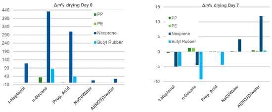 Mass gain of polypropylene (PP), polyethylene (PE), neoprene and butyl rubber samples after 7 days of immersion in the five different PCMs and after drying in laboratory conditions for 0, 1, and 7 days.