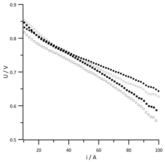 I-V characteristics of a middle single cell. Geometric surface area S = 96 cm2, current load change rate di/dt = 40 mA s−1. RH of reactant gases (•) 10%, (◦) 30%, (▪) 50%, (▫) 80%.