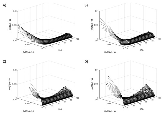 Impedance spectra of the PEMFC middle cell obtained in galvanodynamic mode. Geometric surface area S = 96 cm2, current load change rate di/dt = 40 mA s−1, and measurement frequencies range from 5–1123 Hz. RH of reactant gases (A) 10%, (B) 30%, (C) 50%, and (D) 80%.