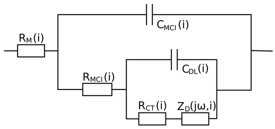 Analysis of the impedance results showed that for each tested RH value of reactant gases, there is a different current range at which the measured impedance values are the lowest, which is the range of optimal current loads of the cell at the set RH value. The widest range of optimal current loads can be observed in Figure 3A, which shows a change in the instantaneous impedance for the lowest reagent humidity. On the same impedance graph for low-current loads, the instantaneous impedance spectra are also significantly shifted toward positive values of the real impedance part, which indicates greater electrolyte resistance; however, to obtain information on the processes determining the fuel cell operation, an in-depth impedance analysis is necessary. For this purpose, the equivalent circuit shown in Figure 4 was used, the selection and validation of which was described by the authors in a previous study [39].