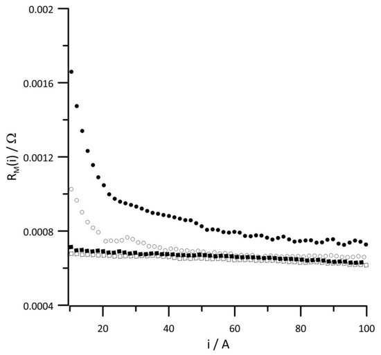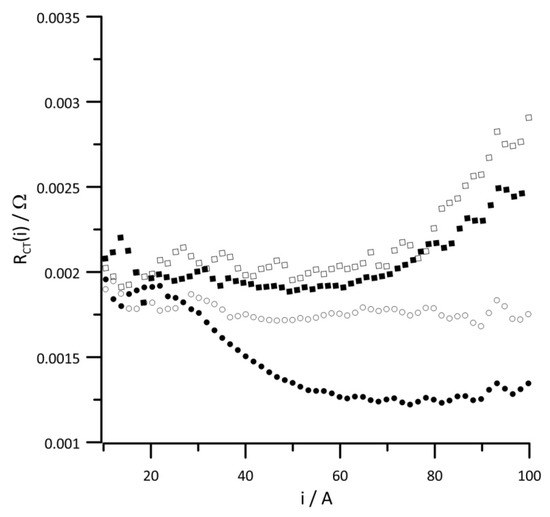 Instantaneous value of versus current at reactant gas RH values of (•) 10%, (◦) 30%, (▪) 50%, and (▫) 80%. Geometric surface area S = 96 cm2, current load change rate di/dt = 40 mA s−1.