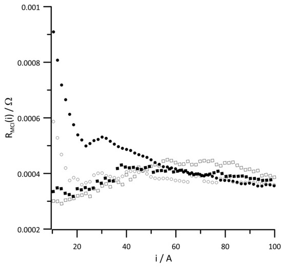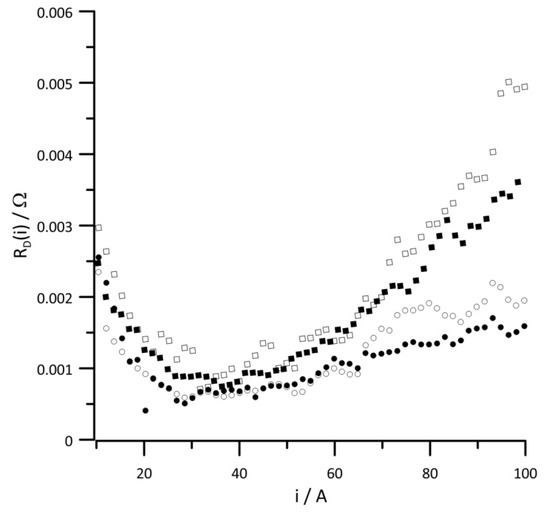 Figure 10 shows the dependence of the instantaneous diffusion resistance as a function of current at different RH values of the reactant gases. The diffusion resistance was determined based on the change in the instantaneous impedance of O atoms describing the finite-length diffusion. At low-current loads, the RD value is independent of the humidity level of the reactant gases. Upon increasing the generated energy, the influence of the water content in the system on the value of diffusion resistance was clearly distinguishable. This value is the highest of all resistances when the RH of the supplied reactants was at least 30% and the current load exceeded 60 A. Only at 10% RH of the supplied reagents was the diffusion resistance lower than the charge transfer resistance in the high-current load range.