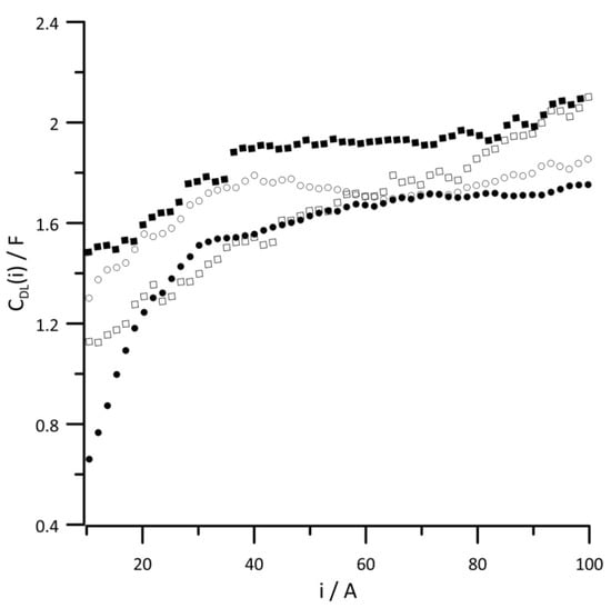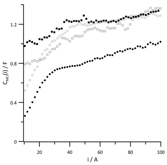 Figure 7 and Figure 8, respectively, show changes in the instantaneous values of CDL(i) and CMCI(i) capacities depending on the amount of energy generated for different reaction gas humidities. The presented relationships have nearly identical function shapes because the values of both capacitances are determined by the platinum content. Since there was much less platinum in the interlayer than the catalytic layer, the capacitance values shown in Figure 7 are almost twice as small as those in Figure 8. In both diagrams, the capacitance values obtained with 10% RH reaction gases are characterized by the lowest capacitance values over the entire current range. On the other hand, too much water in the catalytic layer can cause local flooding, which leads to the loss of catalyst active sites, which is followed by increased capacitance. At low-current values, when the cathode potential is high, the oxygen reduction reaction occurs on the surface of oxidized platinum [43,44,45], which is associated with the smallest capacitance values over the whole range of tested current loads.