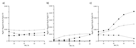 Based on the presented results, three current values were selected, and then changes in individual equivalent circuit parameters obtained from impedance analysis as a function of RH are presented in Figure 11.