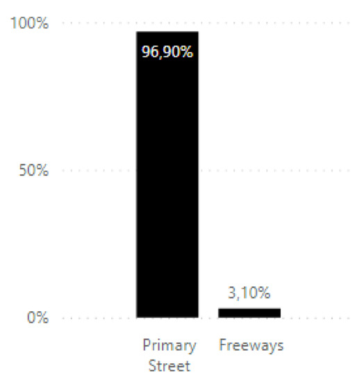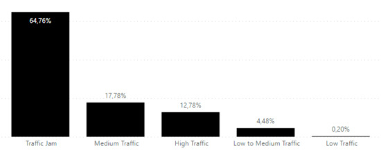 Figure 3 displays the distribution of traffic levels presented for both freeways and primary streets: 64.76% of the traffic corresponded to a level 5 occurrence (traffic jam), 17.78% to level 3 (medium traffic), 12.78% to level 4 (high traffic), 4.48% to level 2 (low to medium traffic), and only 0.20% to level 1 (low traffic).