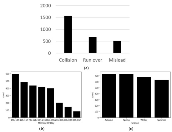 Figure 6a–c shows the road accident distribution by type, hour of the day, and season of the year.