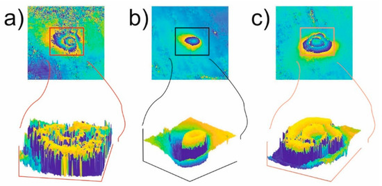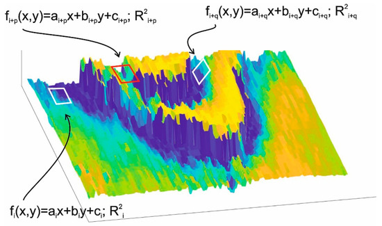 where (x,y) are the local coordinates of the interferogram. A fragment is classified as an area where a monotonic change of the phase value occurs if the a and b coefficient absolute values of the approximating equation as well as the value of the fitting coefficient R2 of the approximated plane and the phase values of the analyzed fragment are within the assumed range of values. Figure 4 shows the approximation of three fragments of the interferogram by the plane described by Equation (1).