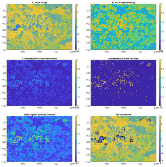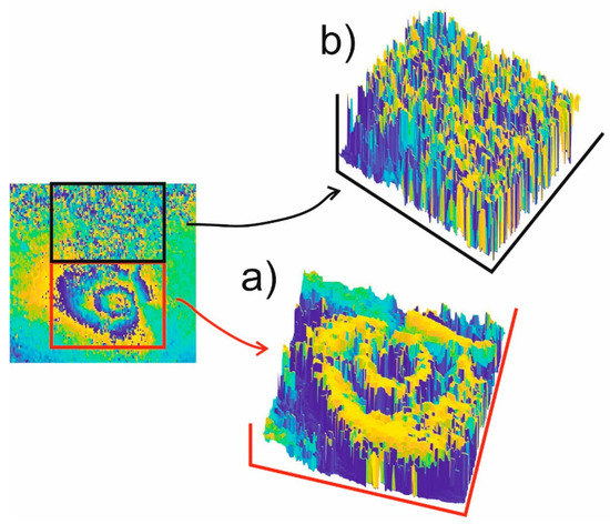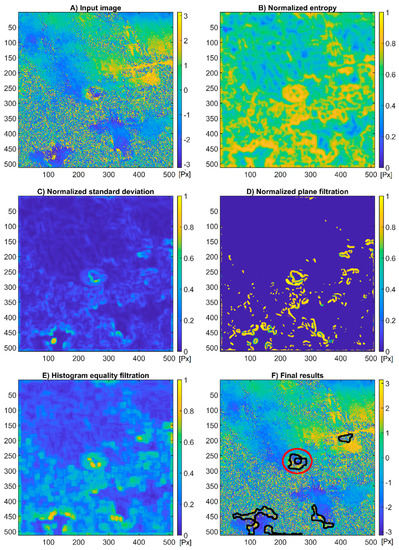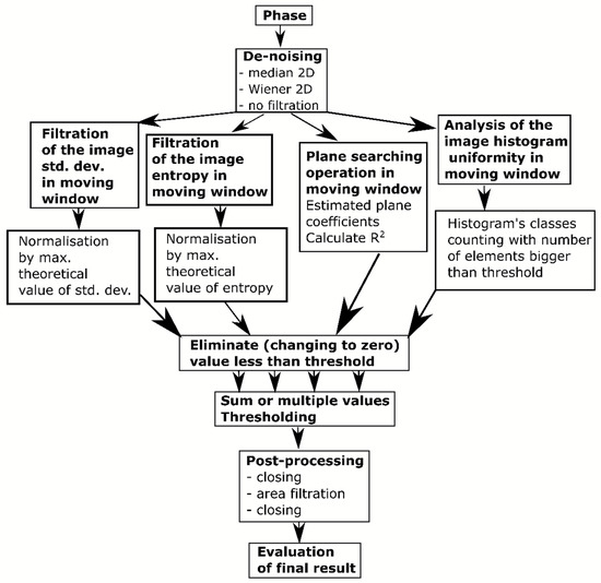 The areas with a phase value step change (from to ) are identified by standard deviation filtration procedures and entropy filtration in a square, moving window. In both cases, such areas of the interferogram are searched for where the normalized standard deviation and entropy value is higher than the threshold value.