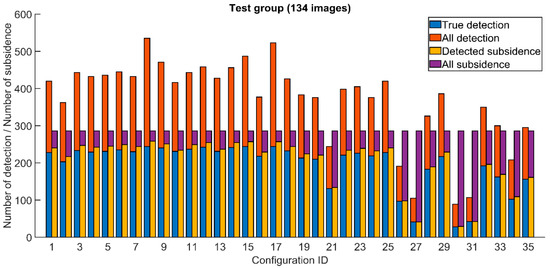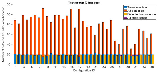 Like for the test set containing a lot of small sections, the test stage was preceded by a manual location of subsidence visible in the interferograms. As a result, 19 subsidence areas were identified and marked. Like for the first set, 35 combinations of the parameter values shown in Table 1 were tested. The results are presented in Figure 9.