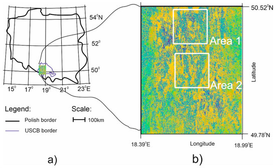The subsidence detection algorithm was also tested for a test set covering a large area. The tests were carried out on two large (1400 × 2000 px each) interferograms (Area 1 and Area 2) with a high concentration of subsidence troughs. The interferograms were computed from images recorded for the Upper Silesian Coal Basin (USCB). The location of the USCB in Poland is shown in Figure 8.