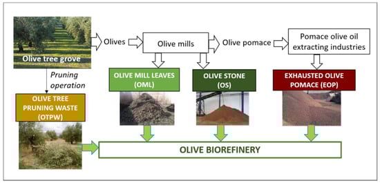 - Manzanares, P.; Ruiz, E.; Ballesteros, M.; Negro, M.J.; Gallego, F.J.; López-Linares, J.C.; Castro, E. Residual biomass potential in olive tree cultivation and olive oil industry in Spain: Valorization proposal in a biorefinery context. Span. J. Agric. Res. 2017, 15, e0206. [Google Scholar] [CrossRef]