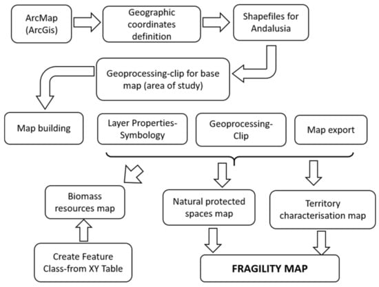 In this work, for the first time, the environmental fragility of the area with the highest olive-derived biomass concentration in Spain has been determined through both environmental and territorial analyses. Moreover, the provisioning capacity of raw materials to the biorefinery and logistical criteria, such as their proximity, are considered in order to select adequate locations for the implementation of the olive biomass-based biorefineries in Andalusia. Additionally, the environmental fragility of the study area, based on both territorial and environmental analyses, was determined using geographic information systems, software ArcGIS (10.2.1 (ESRI, Inc., Redlands, CA, USA). ArcGIS is a powerful tool used in the field of Geographic Information Systems (GIS) that is able to describe and explore partial data and integrate theory and methods to process spatial data. In addition, it is composed of spatial coordinates and professional attributes, being able to generate orthophoto maps once the data have been processed [18,19]. As a result of the whole study, three locations in areas with high biomass availability are chosen and proposed as biorefinery sites.