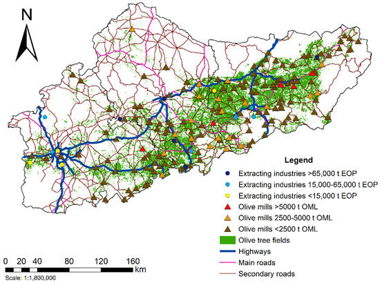 Likewise, the extracting industries that would supply the EOP were geographically located. These facilities were classified into three groups according to the amount of EOP generated, which is directly related to the amount of olive pomace processed by them.