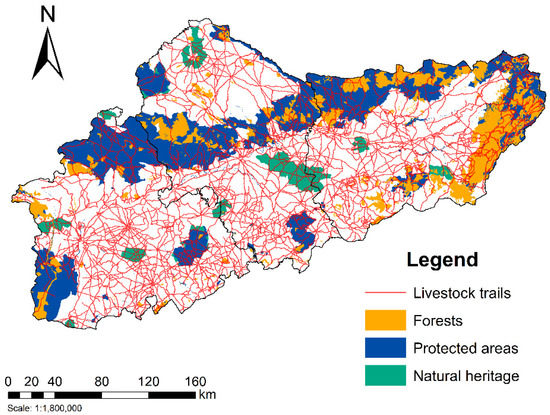 The environmental analysis of a territory implies identifying the geographical location of its protected natural areas, natural heritage, forests and livestock trails. The information corresponding to all these environmental elements was combined to obtain the protected natural site map in the study area (Figure 4).
