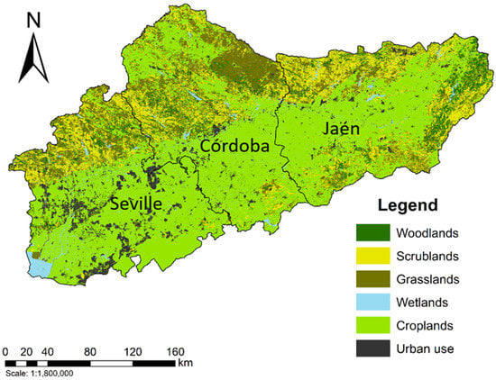 In addition to identifying and geographically locating the protected areas, it is necessary to know the land cover and use in the study area. This information will facilitate the selection of the best geographic locations for the implementation of the olive biorefineries. According to the classification established in Section 2.3.3, in the cropland category, olive tree cultivation makes up the main woody crop in Andalusia, and also in the study area. In this work, the category of urban territory includes residential, industrial and mining uses, as well as bare lands or lands with vegetation covering less than 20%.