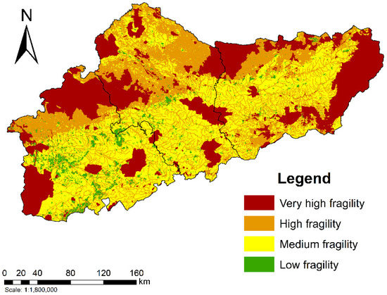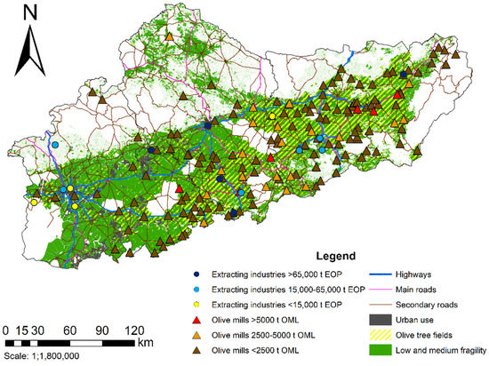 The fragility of a territory determines its capacity for the introduction of new land uses. The study of the environmental vulnerability of a territory allows for the identification of its most sensitive areas, which must be discarded for the implementation of industrial activities [22]. In this work, the capacity of the study area for introducing the olive biorefineries was evaluated by determining its environmental fragility. This parameter was evaluated based on the environmental and territorial analysis of the study area. In addition, the hydrographic network in this area, which corresponds to the hydrographic network of the Guadalquivir River that crosses the three provinces in the study, was geographically located and considered to determine the environmental fragility of the territory (map not shown). The procedures for environmental fragility mapping described in Section 2.3.4 were applied to the study zone. The information layers obtained from both environmental and territorial analyses were overlapped to obtain the fragility map of the study area. (Figure 6). Environmental fragility maps are essential tools for quantifying environmental sensitivity and for understanding the relationship between human activities and environmental quality [27].