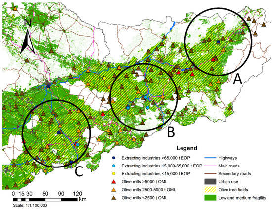 Considering all these requirements, three sites with high availability of biomass resources in low fragility areas were selected as suitable locations for the implementation of these industrial facilities (Figure 8). As can be observed in the map, the areas with the highest biomass availability coincided with low and medium fragility areas. Medium fragility areas correspond to olive tree fields and low fragility areas correspond to industrial areas where olive mills and extracting industries are located. In these industrial zones (low fragility areas) surrounded by olive tree fields (medium fragility areas), three alternatives of geographic locations (A, B and C) were proposed for the implementation of the olive biorefineries. The three locations chosen included several small and medium-sized olive mills and at least one medium or large extracting industry. This fact is related to the possibility of locating the biorefinery as a process integrated with the extracting industries, which are considered to be facilities with greater technological developments than olive mills.