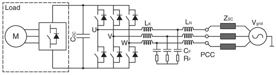 is used for the filter design. For low frequencies, a purely inductive weak grid with a relative short circuit power of rsc = 10 is still assumed, which leads to a grid inductance of = 1.4 mH. For all harmonic frequencies, the grid impedance is higher than the approximation that is given in [38], which leads to an additional safety margin.
